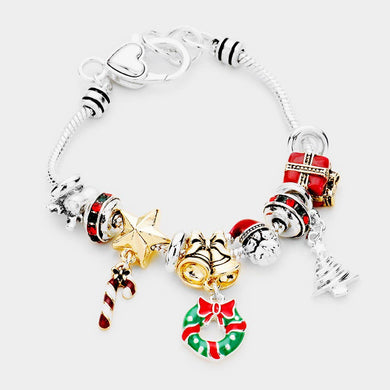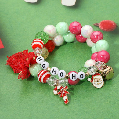 HO HO HO Candy Cane Santa Charm Bow Beaded Stretch - Multi Layered Bracelets