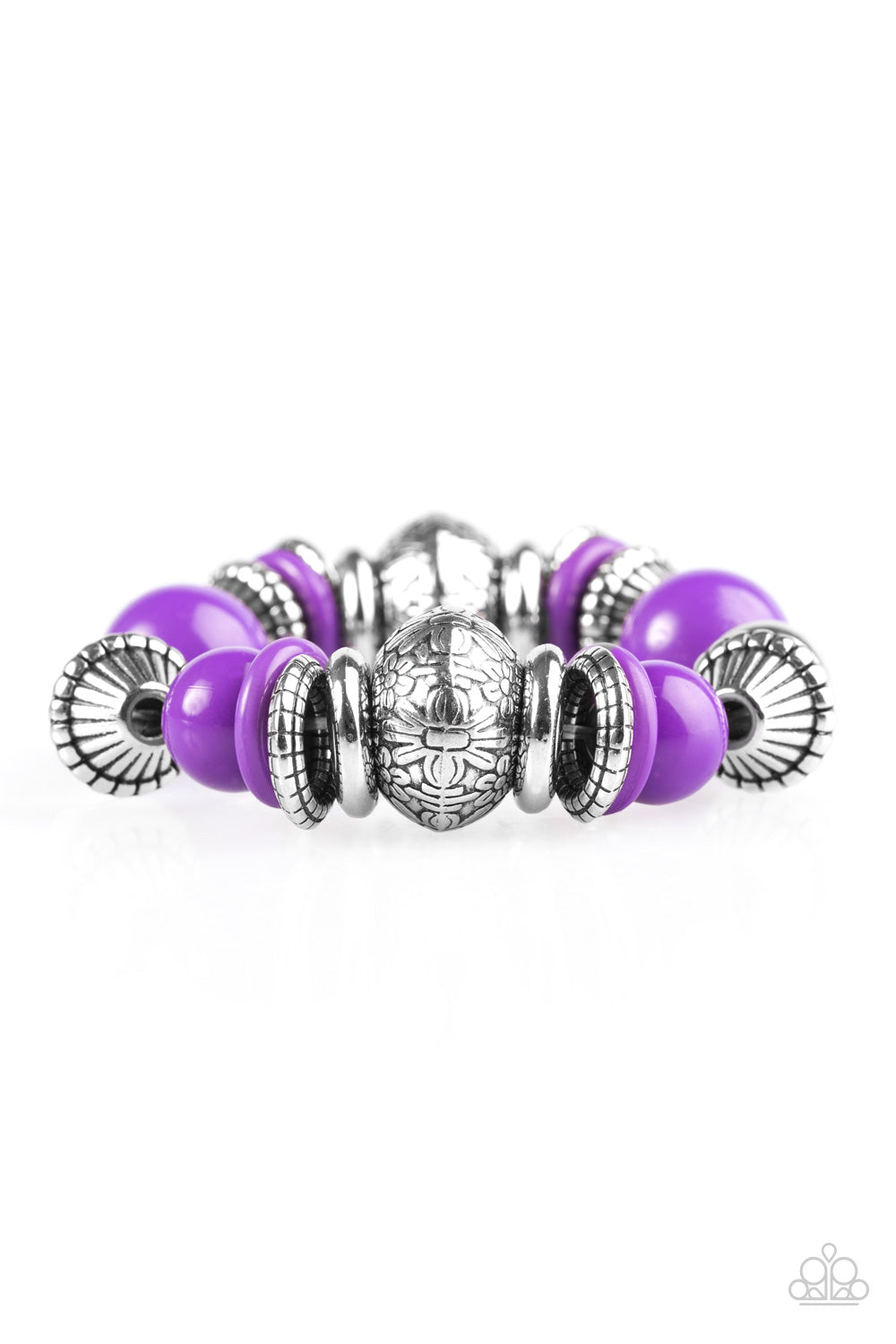 Embossed in a whimsical floral pattern, chunky silver beads, mismatched silver accents, and vivacious purple beads are threaded along an elastic stretchy band for a seasonal look.