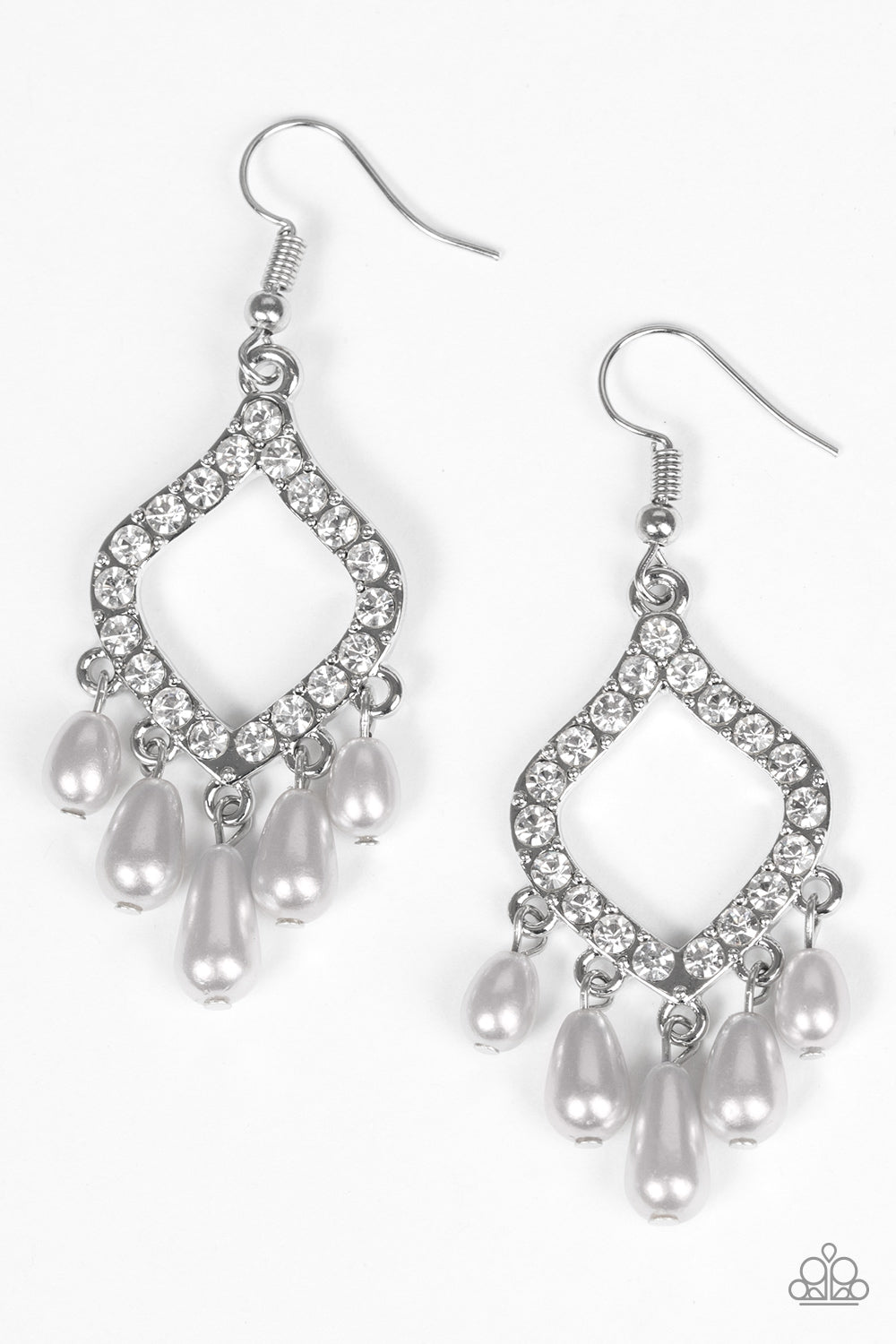 Encrusted in glassy white rhinestones, a shimmery silver frame gives way to a pearly silver fringe for an elegant fashion. Earring attaches to a standard fishhook fitting.