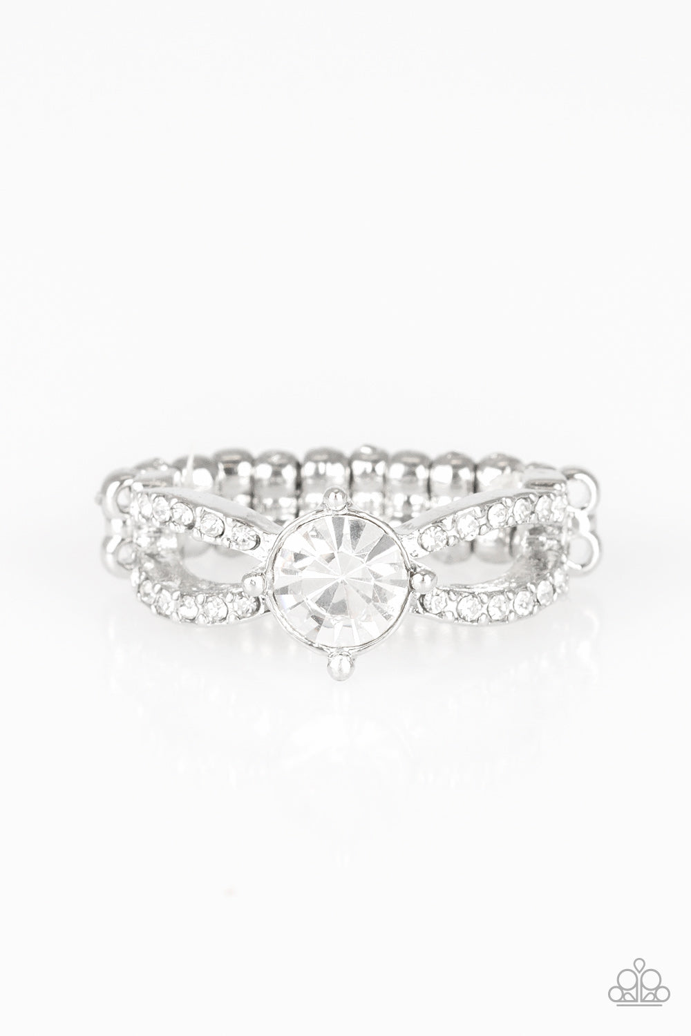 Encrusted in dazzling white rhinestones, glistening silver bars join across the finger. A glittery white rhinestone adorns the center of the sparkling bands for a glamorous finish. Features a dainty stretchy band for a flexible fit.