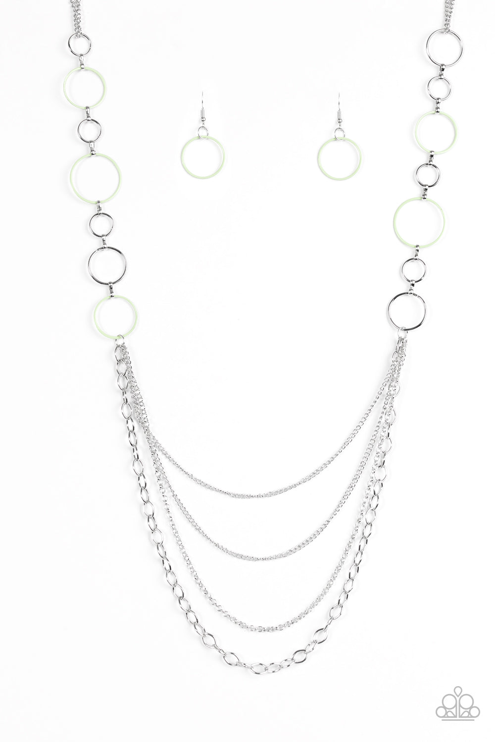 Refreshing green and shiny silver hoops give way to layers of mismatched silver chain for an edgy look. Features an adjustable clasp closure.