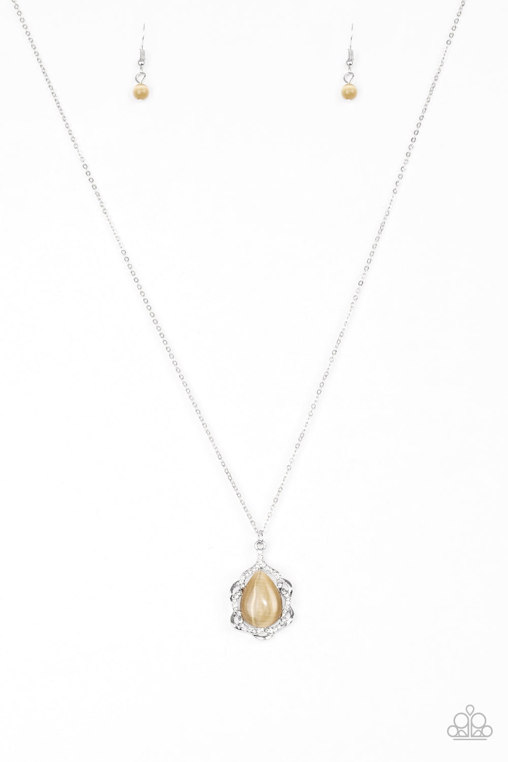 Encrusted in glittery white rhinestones, shimmery silver bars fold around a glowing brown moonstone teardrop, creating a whimsical pendant. Features an adjustable clasp closure.