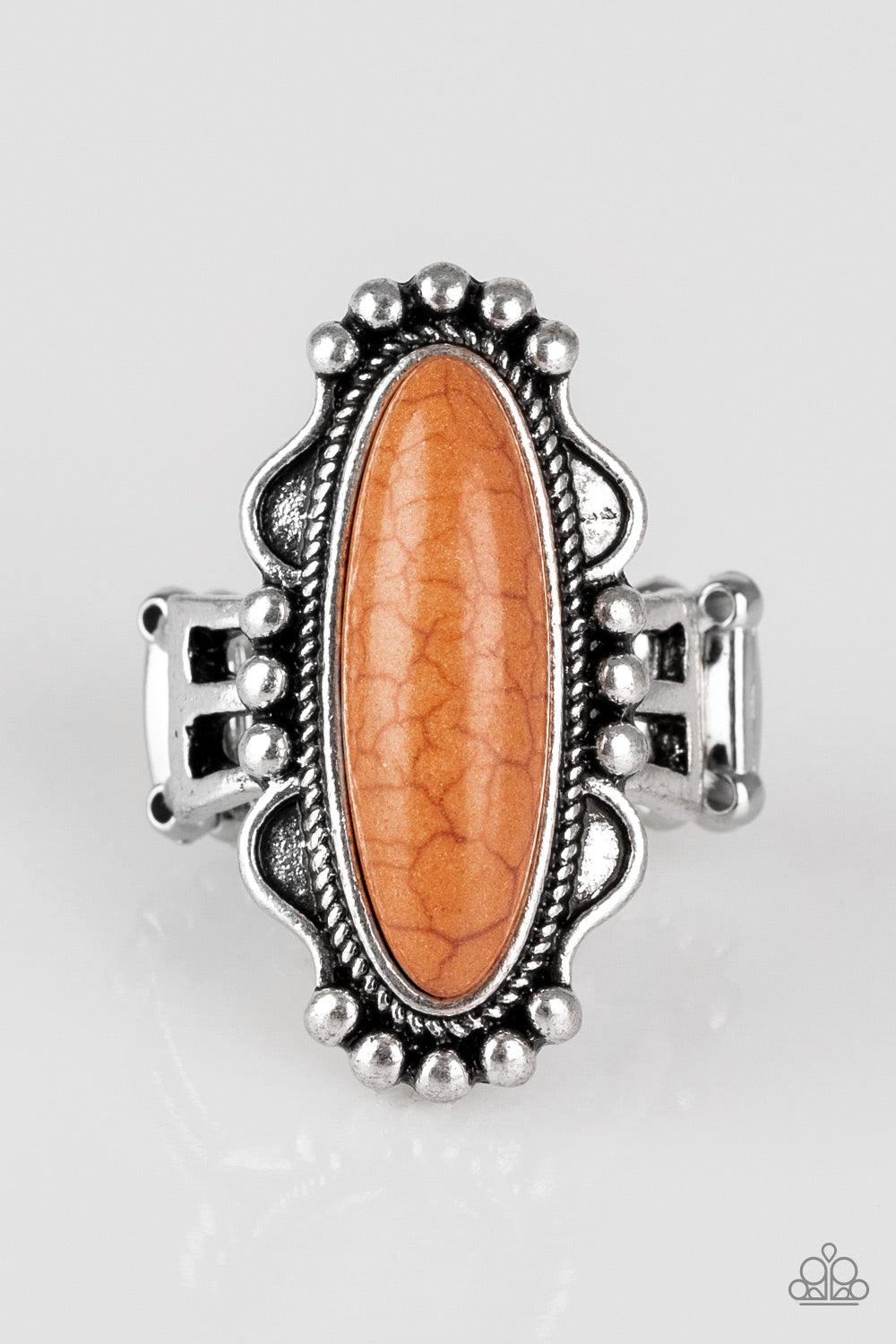 Tinted in the toasty shade of Meerkat, an oblong brown stone is pressed into the center of an ornate silver frame for a seasonal look. Features a stretchy band for a flexible fit.
