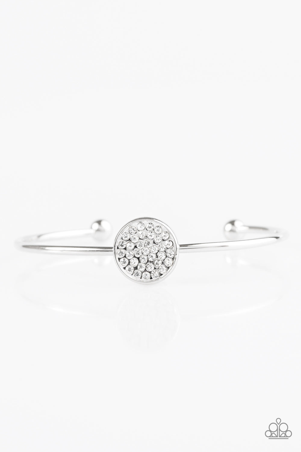 Encrusted in glassy white rhinestones, a dazzling frame is pressed into the center of a dainty silver cuff for a glamorous look.