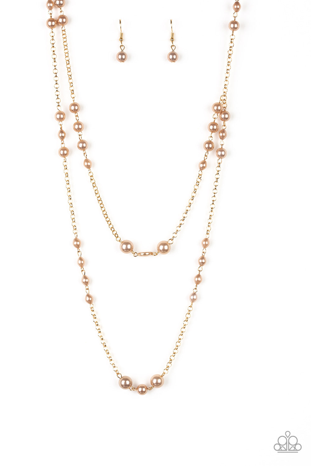 Varying in size and shape, pearly beads trickle along two gold chains, creating refined layers across the chest. Features an adjustable clasp closure.