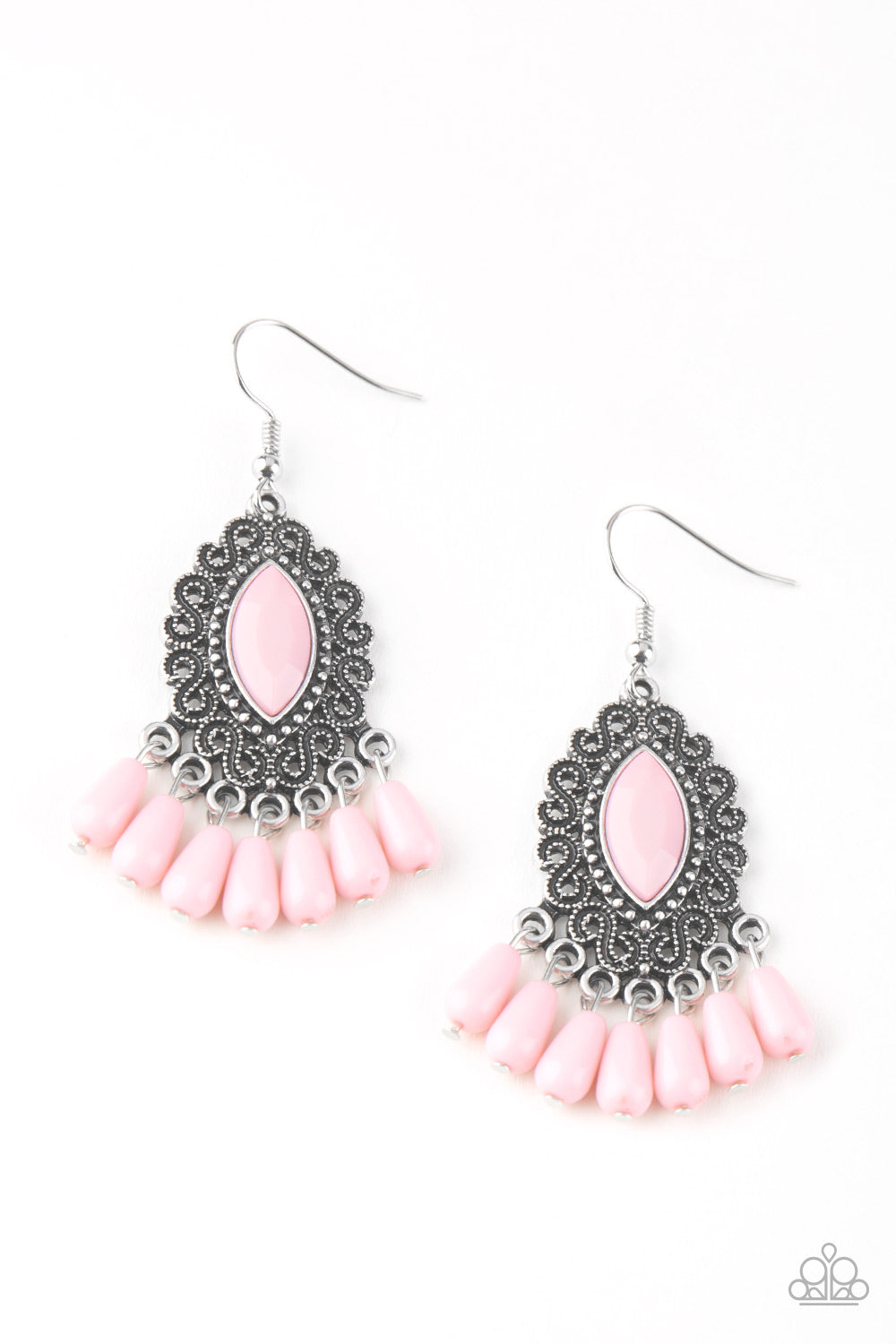 A faceted pink bead is pressed into the center of a studded silver frame radiating with antiqued filigree. Matching pink beads swing from the bottom of the frame, creating a whimsical fringe. Earring attaches to a standard fishhook fitting.