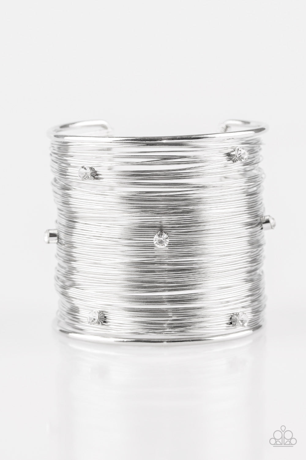 Shimmery silver wires wrap back and forth along a silver frame, creating a bold cuff. Glassy white rhinestones are sprinkled across the dramatic cuff for a glamorous finish.