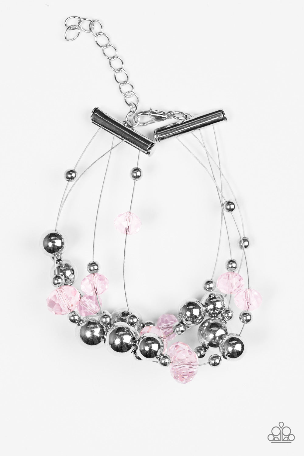 Glittery pink crystal-like and glistening silver beads are threaded along shimmery wires, creating floating layers across the wrist. Features an adjustable clasp closure.