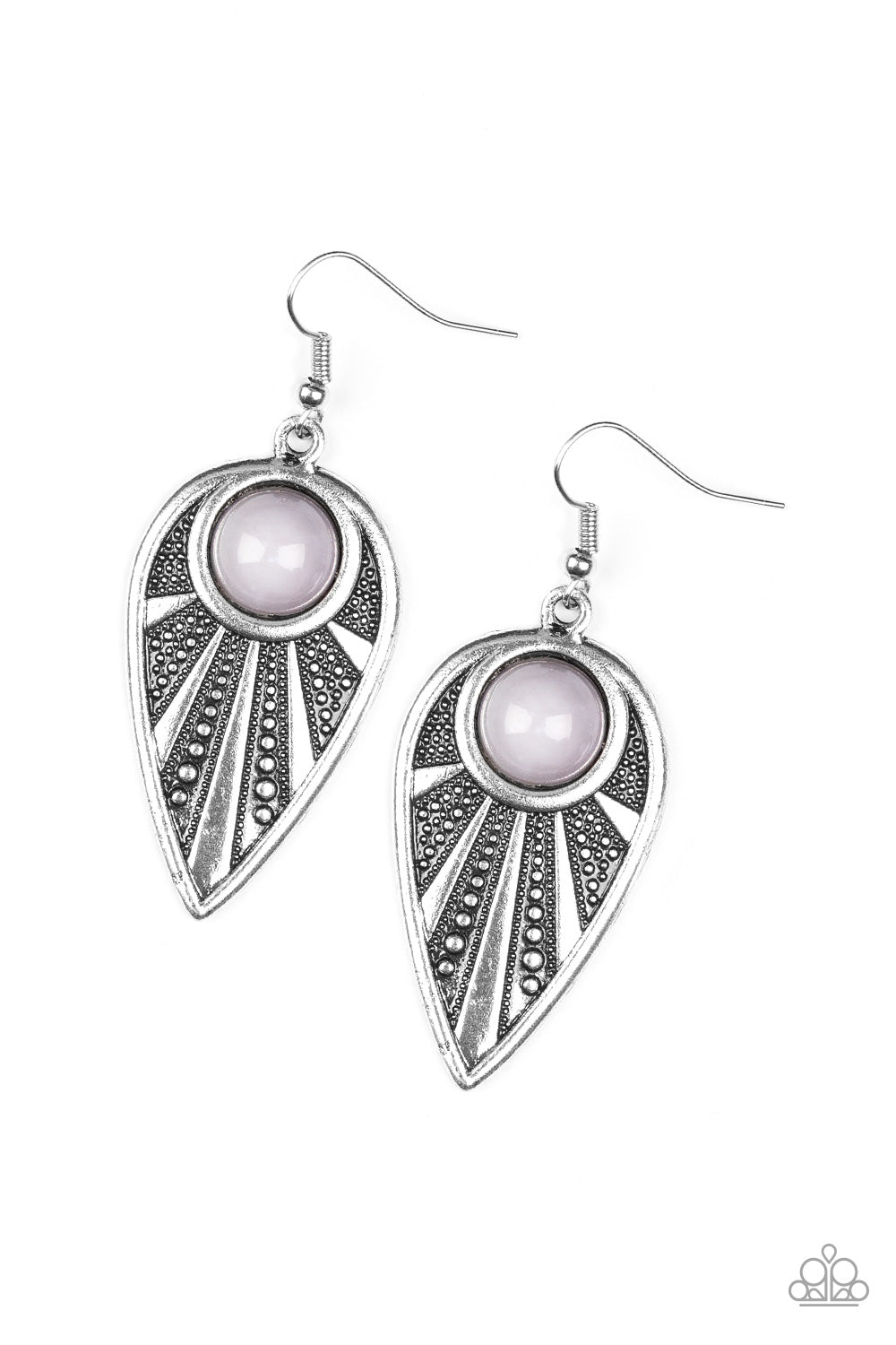 A polished gray bead is pressed into the top of an ornate silver teardrop radiating with studded textures for a tribal inspired look. Earring attaches to a standard fishhook fitting.