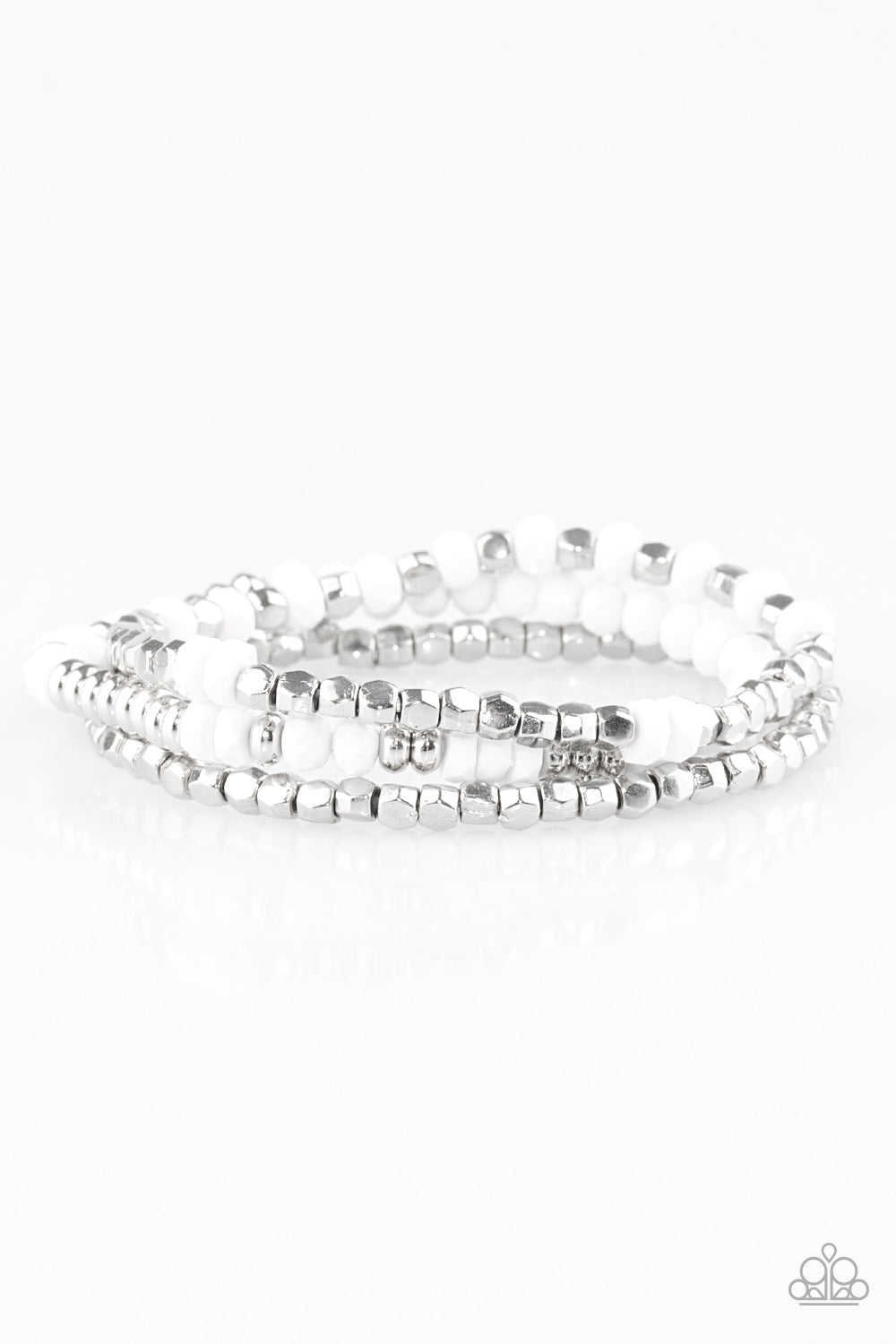 A mishmash of faceted white and silver beads are threaded along stretchy elastic bands, creating colorful layers across the wrist.