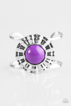 A dramatic purple bead is pressed into the center of a scalloped silver frame, creating a bold centerpiece atop an airy silver cuff.