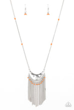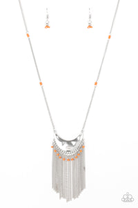 A delicately hammered silver crescent swings from the bottom of an elongated silver chain infused with orange seed bead accents. The tribal inspired pendant gives way to a shimmery fringe sprinkled with more seed beads for a wanderlust finish. Features an adjustable clasp closure.