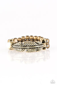 Brushed in a glistening finish, a brass feather arcs across the finger. A dainty white bead dots the tip of the feather, adding a simple splash of color to the seasonal palette. Features a dainty stretchy band for a flexible fit.