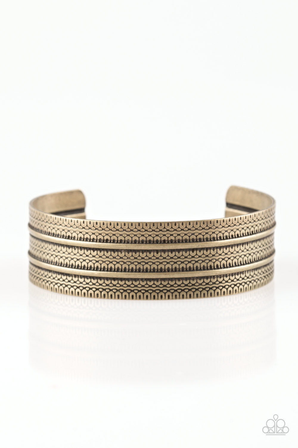 Stamped in tribal inspired patterns, an antiqued brass cuff wraps around the wrist for an indigenous look.