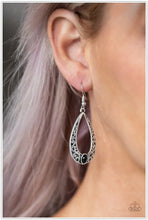 A shiny black bead is pressed into the bottom of a teardrop frame embossed in silver vine-like filigree for a whimsical look. Earring attaches to a standard fishhook fitting.