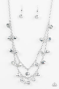 Splashed in a metallic shimmer, faceted crystal-like beads drip from two shimmery silver chains below the collar for a glamorous look. Features an adjustable clasp closure.